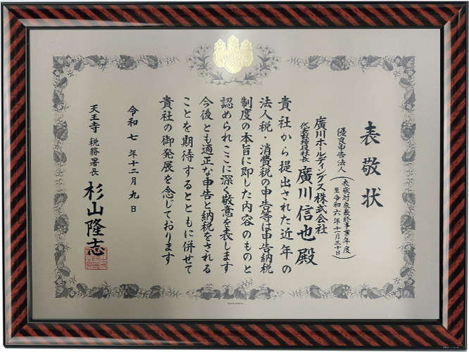 「利益の有無にかかわらず、正直に数字を残す—それが商いの王道」という考えのもと、常に適正な税務に取り組んできた姿勢が評価されたものです。